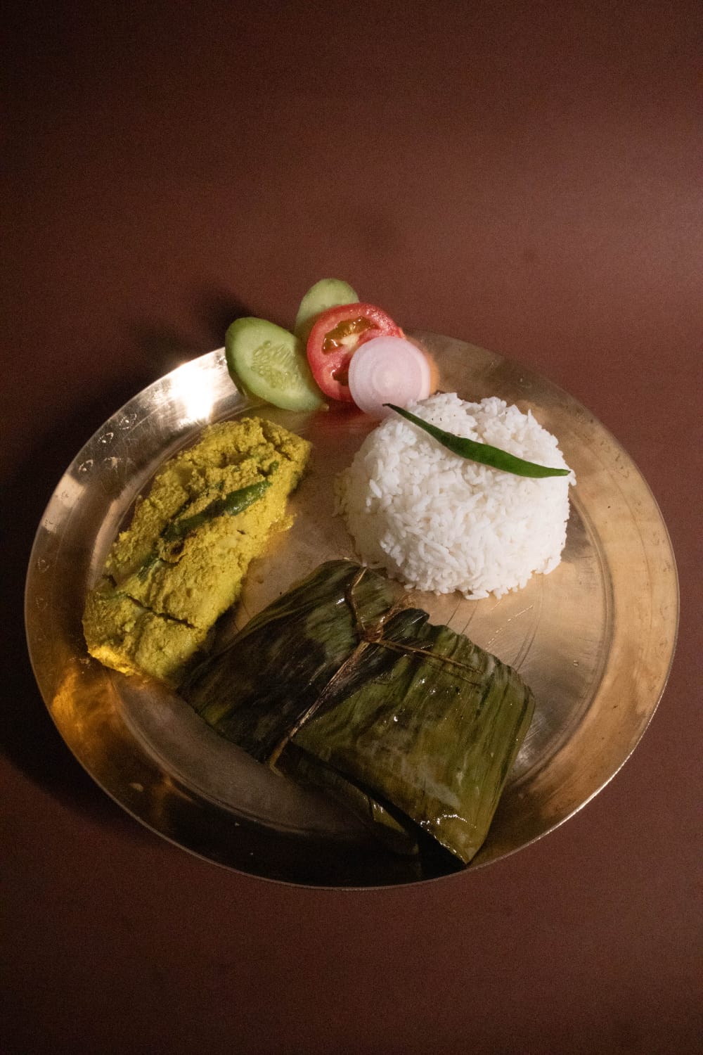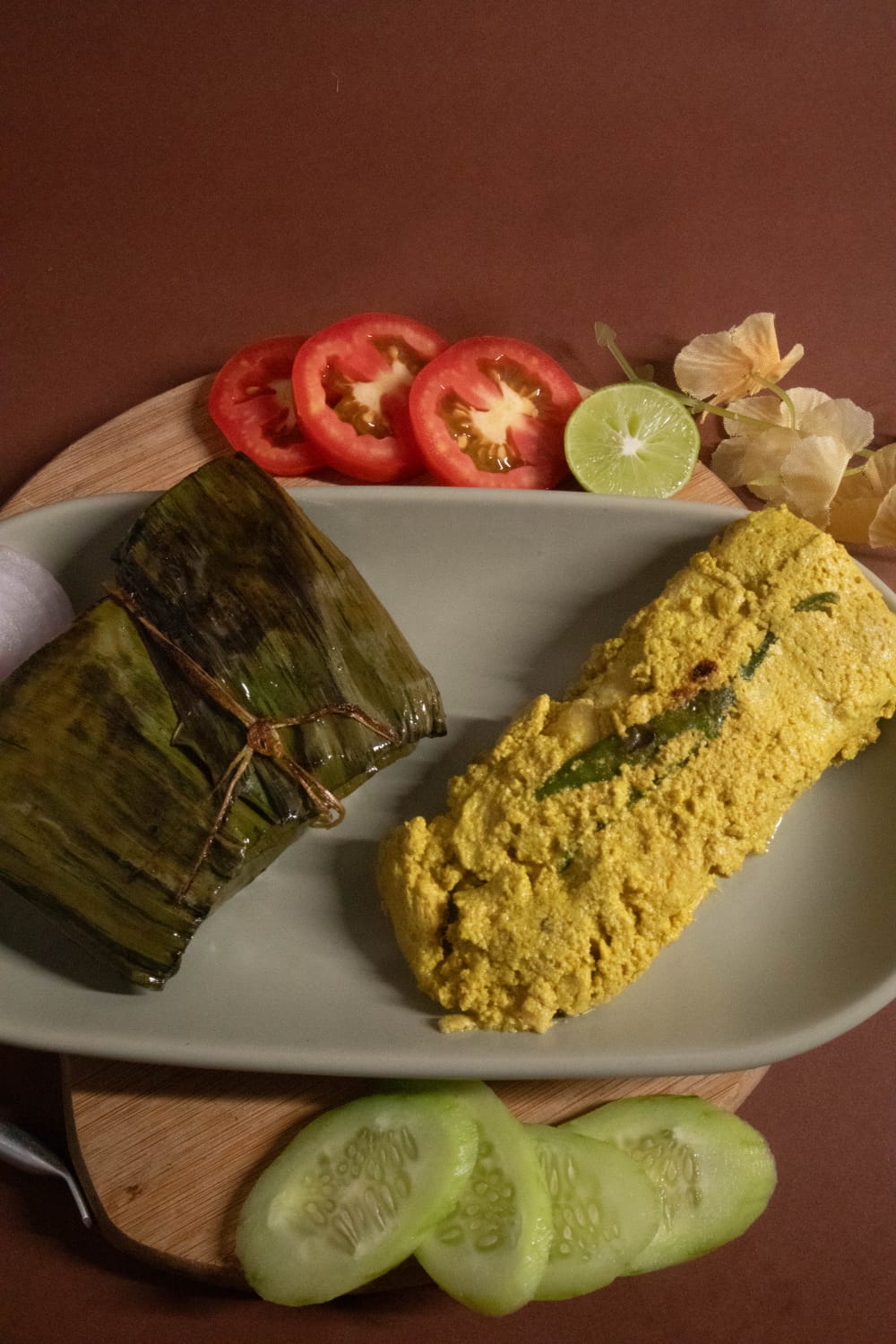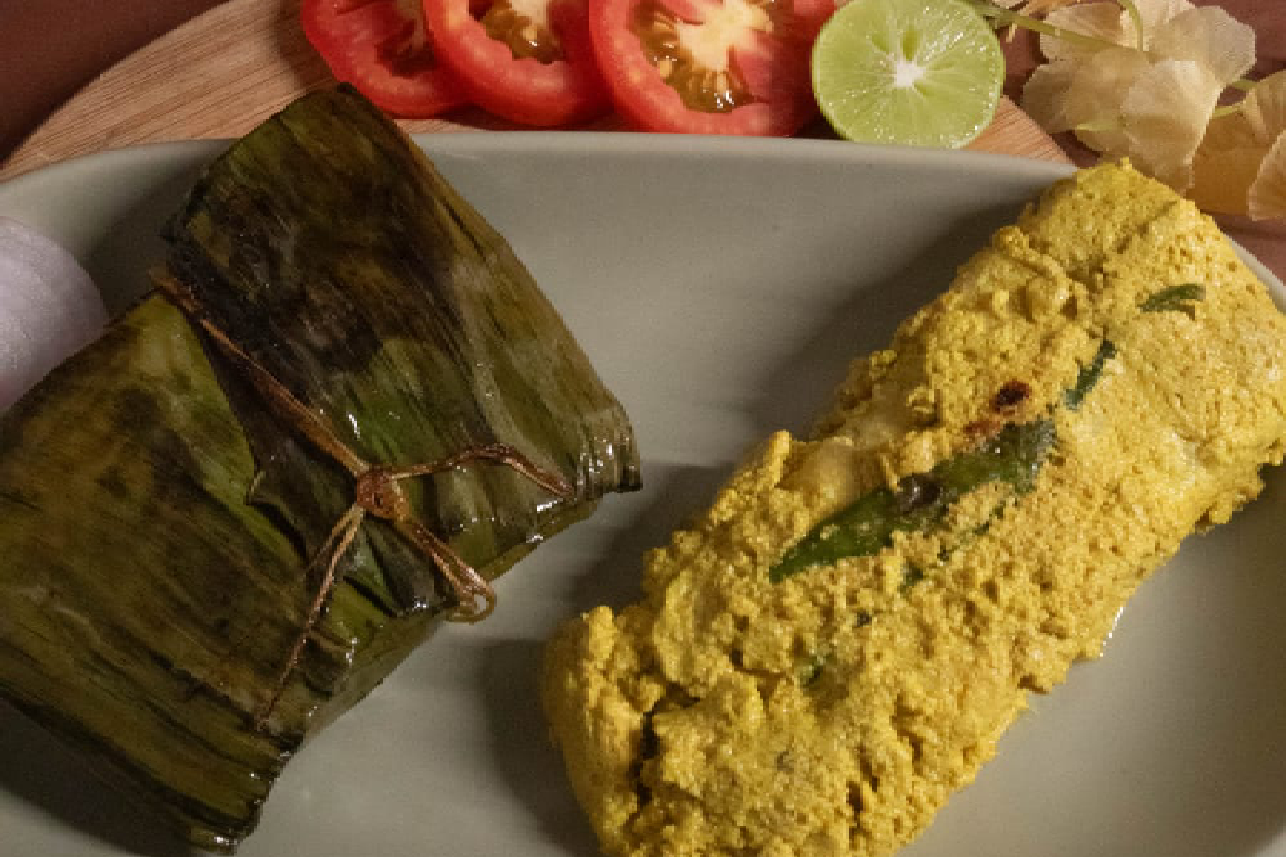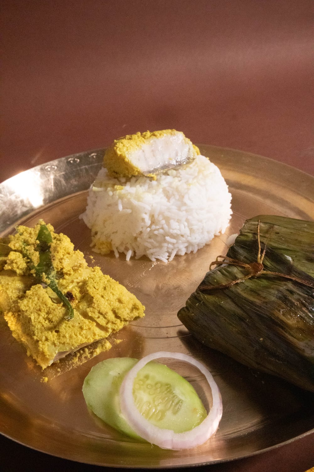 Bhetki Fish coated with mustard and poppy seed paste wrapped in banana leaves and streamed, in Authentic Bengali style.