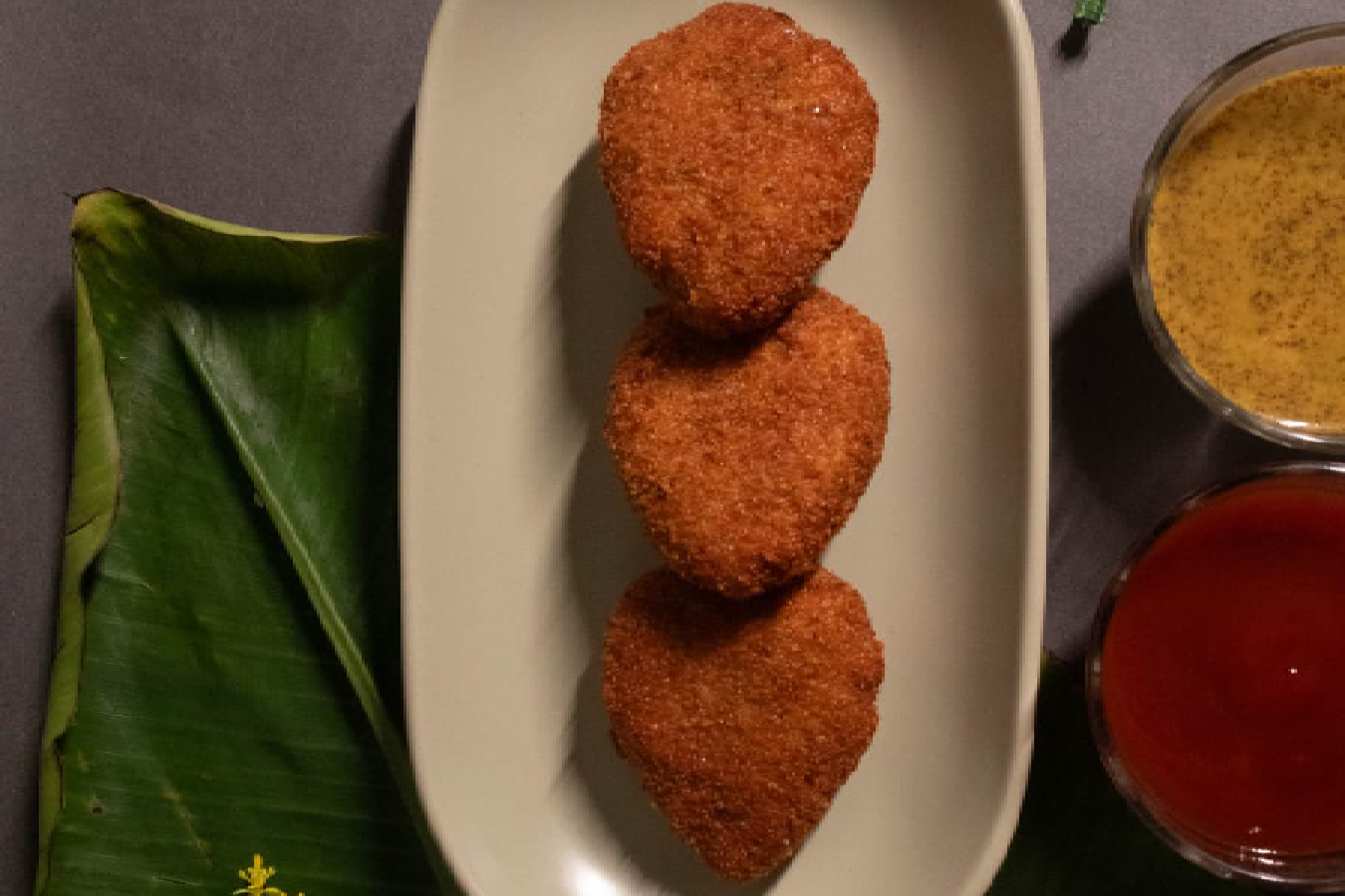 Boneless Chicken marinated and coated with traditional spices. Double coated with breadcrumbs and deep fried. Served with kasundi and salads